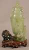 the oval tapered vase with lid having crouching figure finial and ring handles, the base with carved buffalo and two boys enticing on naturalistic plinth, with hardwood stand, late 19th century (right hand ring handle with hairline)