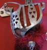 the plated double edged etched blade with the crowned cypher of G V R, the basket hilt of conventional plated form with buff leather liner covered in red felt with blue binding and red fringe, the grip covered in black dogfish skin bound with silver wire; in leather scabbard with belt straps
