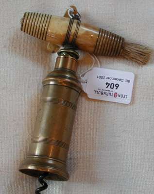 the turned bone handle with fitted cork brush above cylinder and corkscrew mechanism
