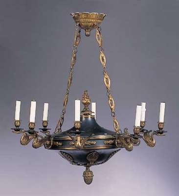 the hollow body of flattened saucer form with flame finial, anthemion mounts and acorn pendent, the eight branches formed as swans each with single nozzle and drip tray, supported by linked chains and ceiling boss