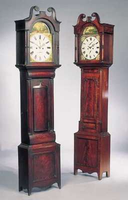 the twin track movement with anchor escapement striking on a bell, the arched enamelled dial painted with swans to the arch and roses to the spandrels, with subsidiary seconds and date dials, the swan neck hood flanked by ring turned columns, the panelled pedestal with shaped splayed feet