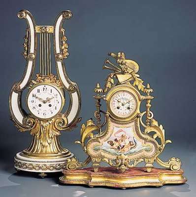 the twin train movement with painted porcelain dial above similar shaped panel painted with cherubs and sea monsters, incorporated in waisted case with musical trophy surmount and flanked by staffs and scrolling acanthus leaves, flattened toupie feet and scrolled lateral consoles (one broken); on a giltwood plinth