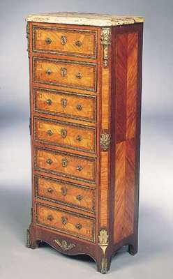 bearing label of W. J. Mansell, London, with gilt brass mounts, the rectangular marble top with moulded edge above seven quarter veneered drawers with leaf cast moulding, flanked by canted angles with scrolled consoles, on shaped plinth