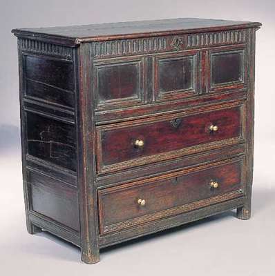 the hinged rectangular top with moulded edge above arcaded frieze and three panels, with two long panelled drawers below, with corresponding three panel sides and stile feet