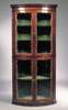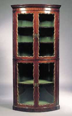 the moulded and projecting cornice above twin glazed doors with shaped and moulded gilt gesso slips enclosing two shelves, the lower section with two similar glazed doors enclosing single shelf, raised on a plith