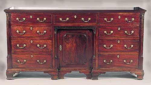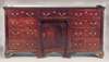 the rectangular top with moulded edge above arrangement of nine short drawers around flat arched recess enclosing panelled door framed by quarter engaged fluted columns with blind fretwork bases and arch, raised on ogee bracket feet