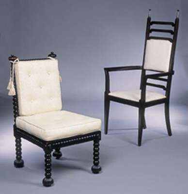 with spindle filled rectangular back above upholstered panel seat on bobbin turned legs with domed and reeded feet, hidden castors