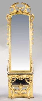 with oil and burnished water gilding, the arched glass with moulded and cast frame and broken surmount centred by crossed arrow and torch 94cm wide, 230cm high (max); the corresponding table with serpentine marble top and scrolling frame with frieze centred by a cabochon, its two scrolling front legs joined by stretcher with urn finial, on mirrored back panel