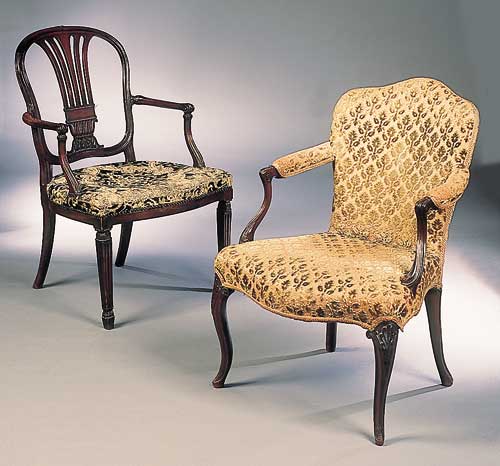 the open waisted back with moulded and leaf carved frame centred by pierced splat back above serpentine scrolling arms and seat rail raised on square section tapering fluted front legs