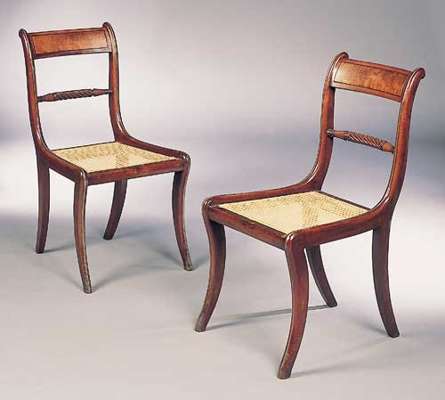 A set of four Regency mahogany and brass lined dining chairs