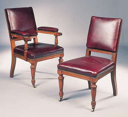 with maroon leather upholstery, including two larger carvers, each with square upholstered back on fluted supports above corresponding seat on carved, turned and fluted tapering legs (10)