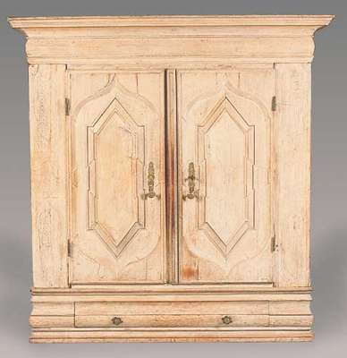 the projecting moulded cornice above a cushion frieze and two twin doors with ogee arched panels flanked by similar panelled flanks, the sides with inlaid panelled, above moulded base with frieze drawer and plith
