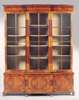 with seaweed marquetry and crossbanding, the moulded cornice with cushion moulded frieze above three astragal glazed doors enclosing adjustable shelves, the base with three quarter veneered panelled doors on moulded plinth and bun feet