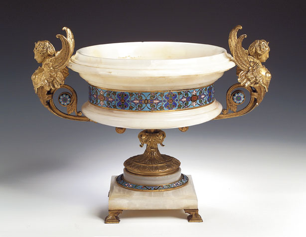 of moulded circular form with band of champleve enamel, flanked by cast sphynx handles raised above a leaf-cast pedestal on square onyx base, similarly decorated and raised on cast brackets