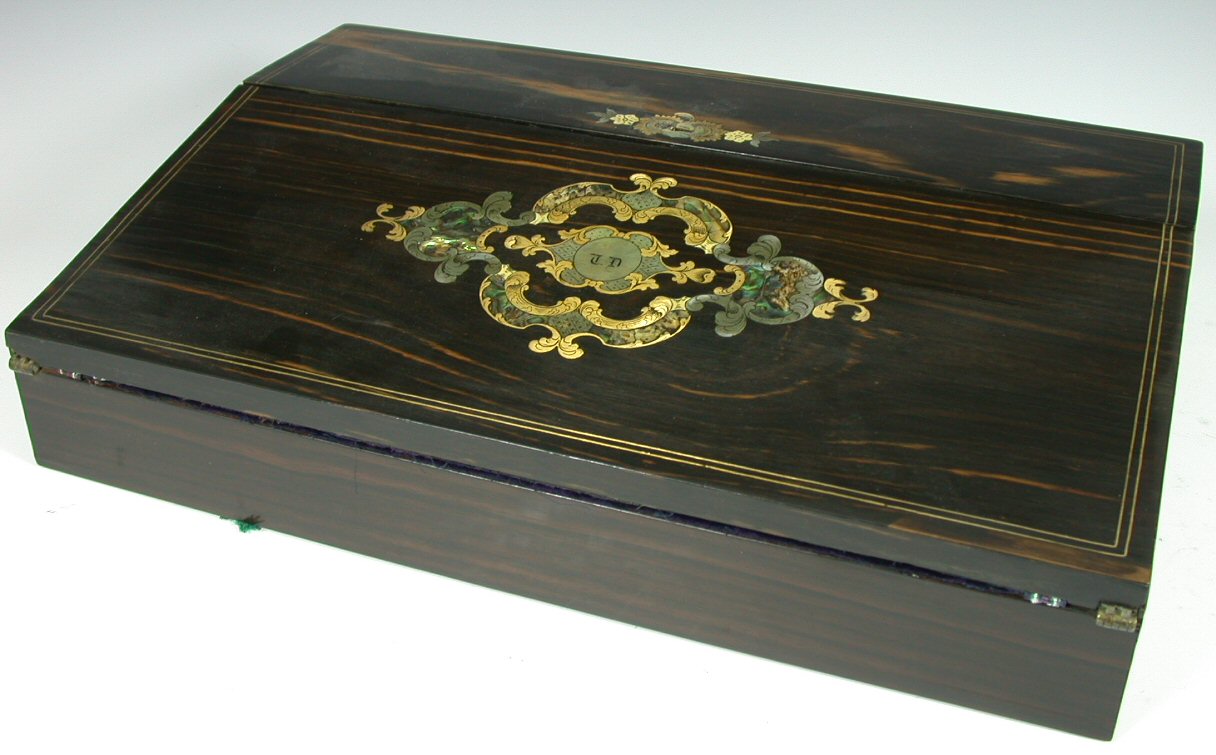 with brass stringing, the rectangular top with sloping fall profusely inlaid with brass and mother of pearl with a scrolling cartouche, opening to reveal a fitted interior