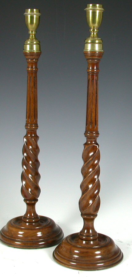 with spirally turned and fluted stems and turned brass vase shaped sockets (2)