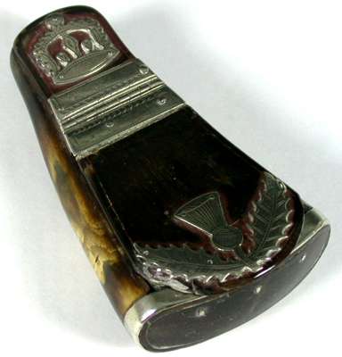 decorated with a silver crown surmounting a thistle and with silver hinge and base rim, the lid with some repairs