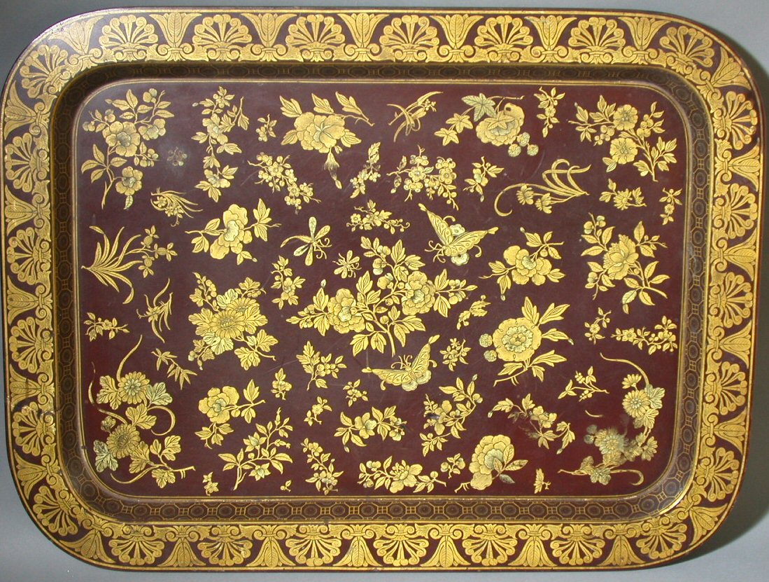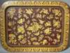 of rounded rectangular form, painted in gilt with allover flower sprigs and butterflies on a deep burgundy ground
