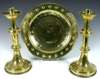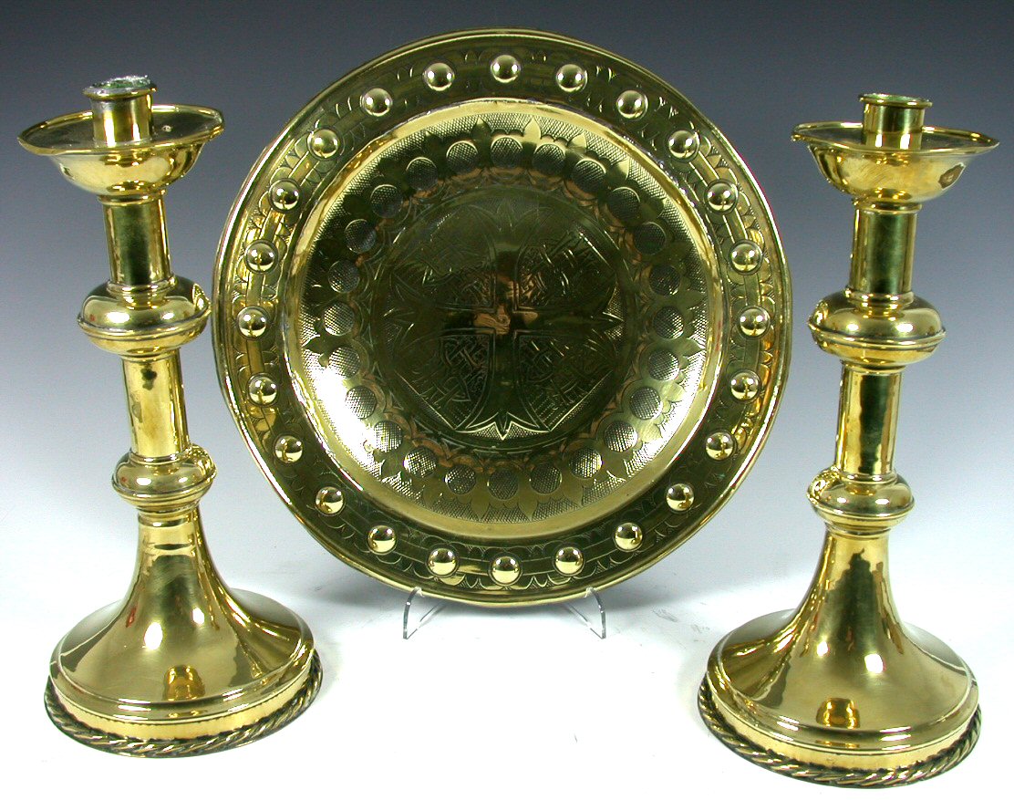 each with broad drip trays above turned and knopped columns with spreading circular bases with rope twist edge, 33cm high; also a circular brass collection plate, chased with stylised foliate bands and centred with a cross