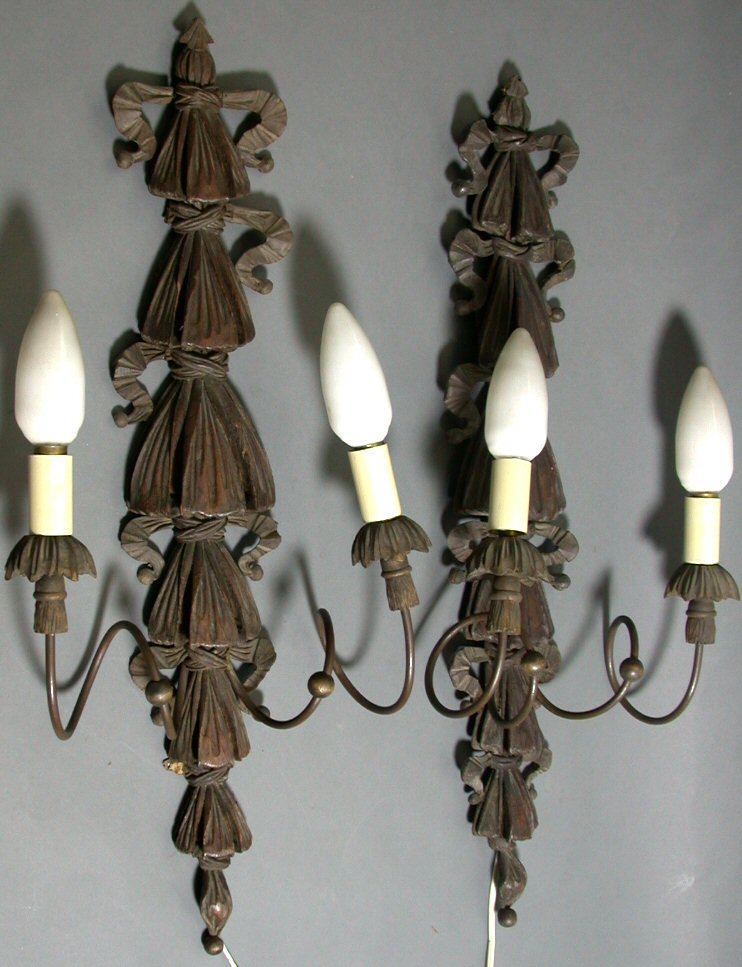 each with backplates carved as ribbon tied pleated fabric banners, supporting two spiral bracket with leaf carved and tassel sconses, adapted for electricity (2)