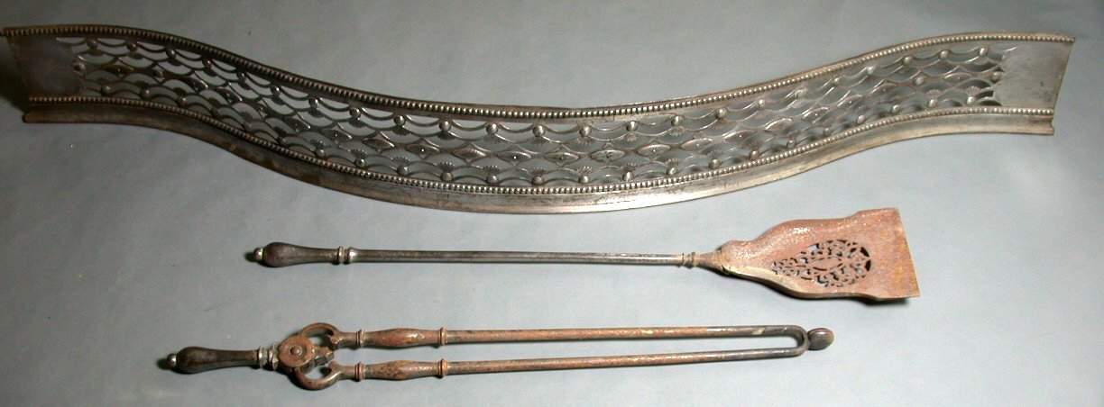 of serpentine form with beaded edge enclosing a pierced and chased gallery, 138cm wide, also a pair of steel fire irons