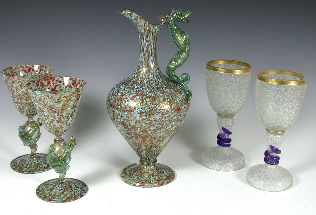 with seahorse cast handle, 30cm high; and a pair of bell bowl goblets, en suite, 19cm high; also a pair of crackle glass goblets with blue and gilt serpent decorated stems
