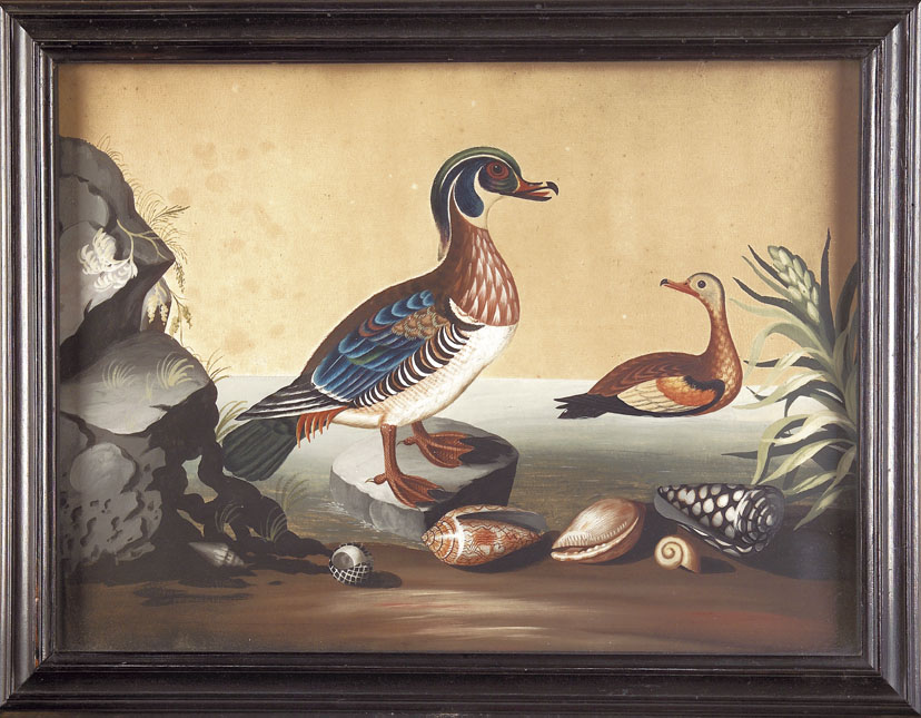 Black-Bill'd Whistling Duck and Purple Waterhen with Corals and Shells, 1755 series, 29cm x 39.5cm, bearing wrong label for the Indian Bee-Eater dedicated to Lady Howth (see lot 207); and Summer Duck, Red-Bill'd Whistling Duck and Shells, 1755 series, bearing label dedicated to the Countess of Hillsborough