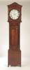 the twin train movement with anchor escapement, the circular painted dial with subsidiary seconds and date dials, the wood with architectural pediment above semi-bowed trunk door and crossbanded base on bracket feet
