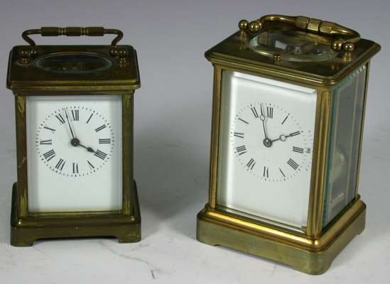 the twin train movement with lever platform escapement, the enamelled dial with Roman numerals within rounded rectangular case on plinth, 13cm high, also o brass carriage timepiece with single train movement, 11cm high (2)