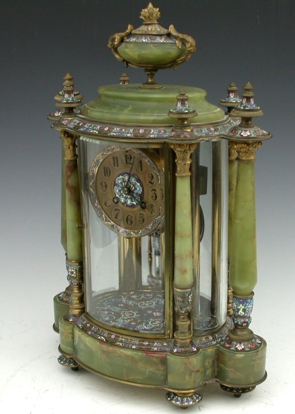 with urn surmount above oval section bevel glazed case, flanked by tapered columns enclosing circular dial, with Arabic numerals, the movement striking the half hours on coiled gong, mercurial pendulumn, on plinth with flattened bun feet