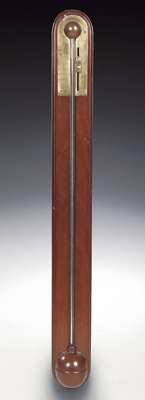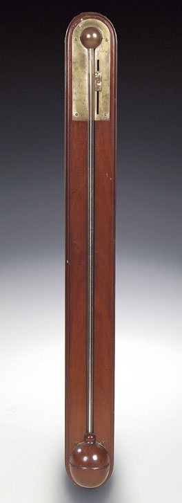 the silvered dial (rubbed) above rectangular body with exposed mercury tube, terminating in domed cover