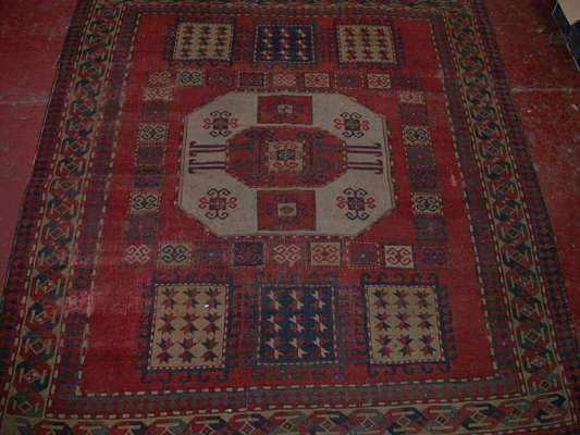 the red field with central ivory octagonal medallion flanked by hooked square medallions, within lemon geometric border between skittle bands