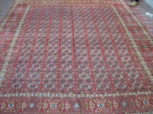 the red field with allover pattern of guls, within red hooked octagon border between bands