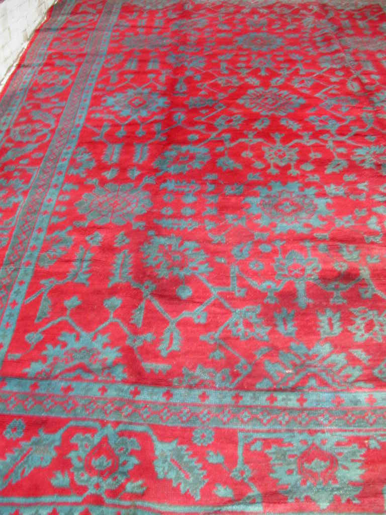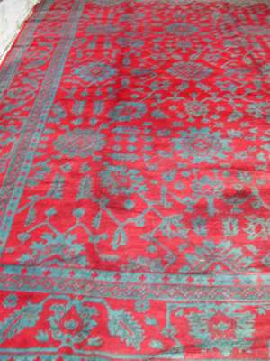 the red field with allover blue medallion, palmette and vine pattern, within red palmette and vine border between bands