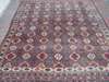 the brown field with allover pattern of polychrome guls, within ivory serrated rosette border between bands, kelim ends