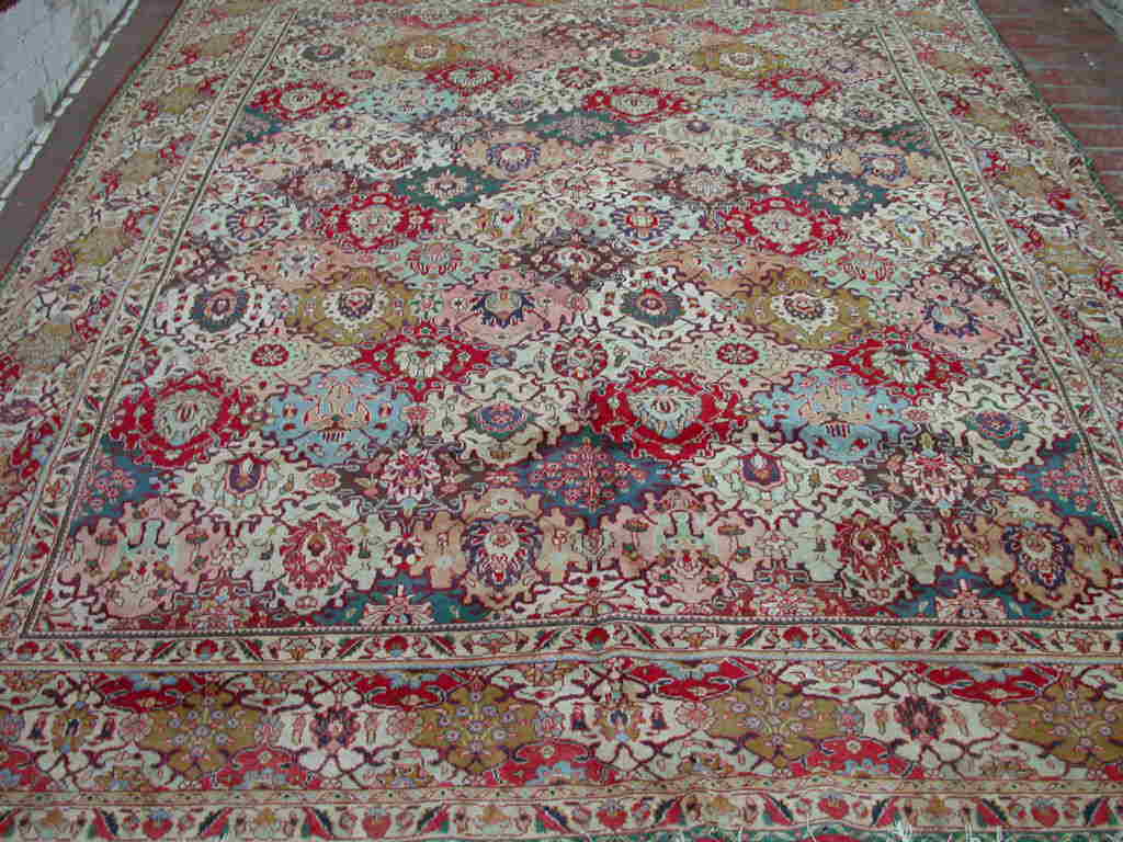 the field with allover polychrome lattice containing palmettes, within similar border between cream scrolling vine bands