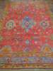 the tomato red field with central blue hooked medallion flanked by lozenge medallions, within blue rosette and vine border between ochre bands