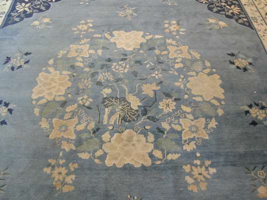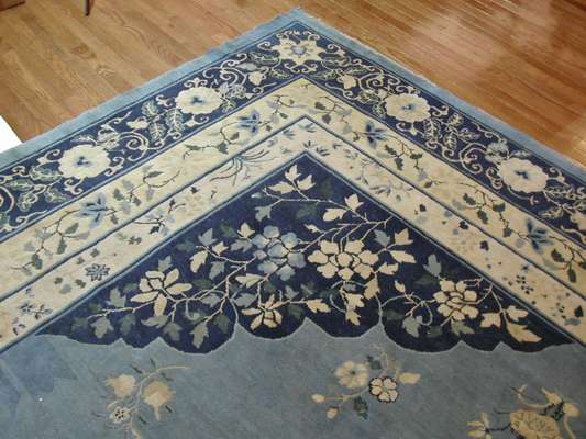 with central floral medallion and pale blue field with darker blue floral spandrels within meandering floral and foliate guard bands and border