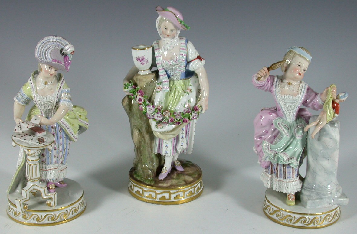 modelled as an elegant lady wearing a lemon cloak dealing a hand of cards on a tripod table on a circular plinth with guilloche border, the other of a young girl smacking her doll's bottom, by a marbled column, underglazed blue sword marks and impressed number marks, 15.5cm high; also another taller similar figure group modelled as a lady by a rustic column with a flower garland, underglazed blue crossed sword marks and impressed number marks