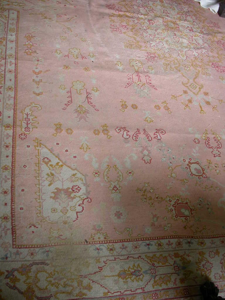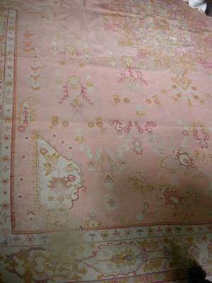 the salmon pink field with central ivory medallion, within ivory cartouche border between bands