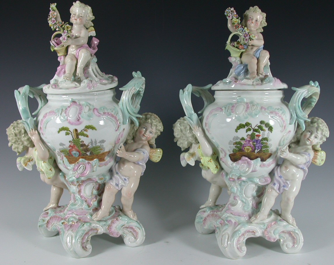 the pierced domed covers with winged cherub surmount above Rococo tapered urn with leaf cast handles and flanked by two winged cherubs, painted with opposed panels of 18th century couples on scrolling quadripartite base, underglaze blue mark