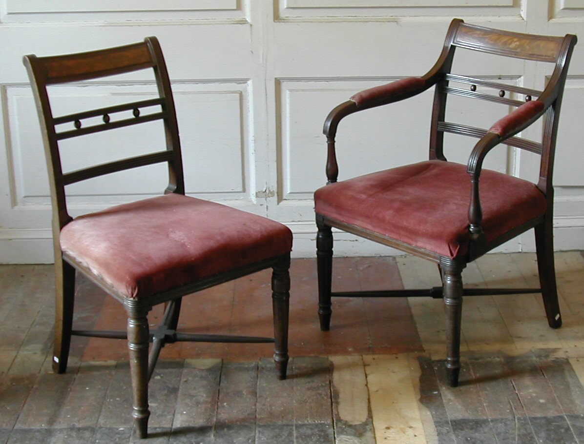 the panelled top rails above centre rails with ball spacers, stuffover seats, on turned tapering legs united by X-stretchers, including one carver