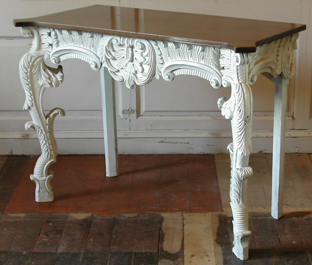 the associated mahogany top above a central scrolled apron surrounded by similar foliate frieze on similarly decorated cabriole legs