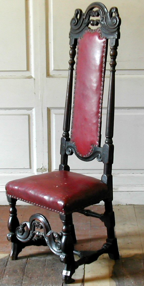 the arched tall back with pierced surmount and turned and blocked uprights, the padded seat supported by flanking turned uprights, the shaped cabriole turned legs united by an arched and pierced front stretcher and turned and blocked stretcher
