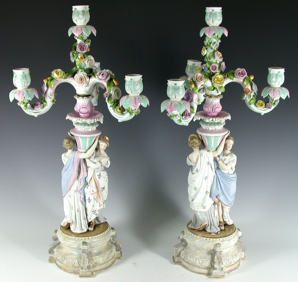 A pair of Dresden four light candelabra,