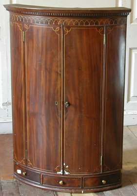 An early 19th century mahogany and boxwood strung hanging bowfront corner cupboard,