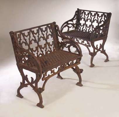 the rectangular backs cast with Gothic tracery enclosed to the sides by leaf cast scrolling arms and legs enclosing a honeycomb pierced seat with pierced tracery apron below