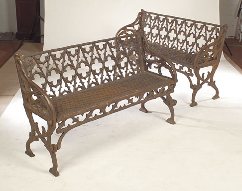 the rectangular backs cast with Gothic tracery linked to the bodies by leaf cast scrolling arms and legs enclosing a honeycomb pierced seat with pierced tracery apron below, matching the previous lot