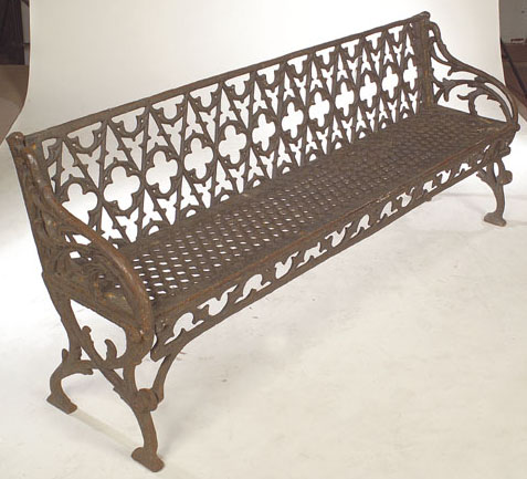 the rectangular back cast with Gothic tracery enclosed to the sides by leaf cast scrolling arms and legs enclosing a honeycomb pierced seat with pierced tracery apron below, matching the previous lot