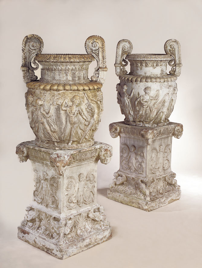 each cast with a frieze of classical figures and gadrooned bandings, the square bases cast with rams' heads to the angles, above arabesque panels on plinth bases